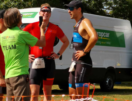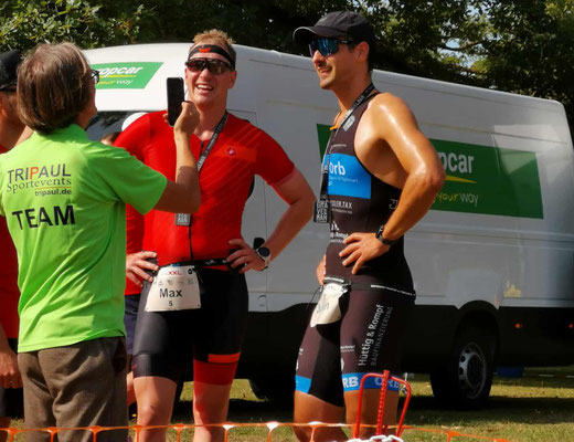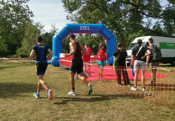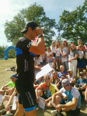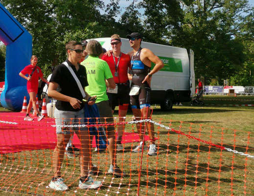 Martin, in Lauf 1 gestartet, hatte zu dieser Zeit bereits sein beherztes Rennen hinter sich. Mit nur wenig Gerangel zwischen den Schwimmern ging es nach dem Start auf die zwei Runden. Aufgrund der kabbeligen Wellen war nicht immer zu sehen, wo sich die nächste Boje befand und wohin der Weg weiter ging. Martin arrangierte sich aber sehr gut mit den Bedingungen und konnte seine Renntaktik wie geplant umsetzten. Nach sehr guten 33:53,73 erreichte er mit starkem Endspurt das Ziel und durfte sich über den 3. Platz in seiner Altersklasse freuen. Auch Trainer Ortwein freute sich riesig: „So kurz nach der Sommer-Trainingspause bei solch widrigen Bedingungen eine Medaille mit Offenbach zu nehmen, ist eine sehr starke Leistung von Martin!“